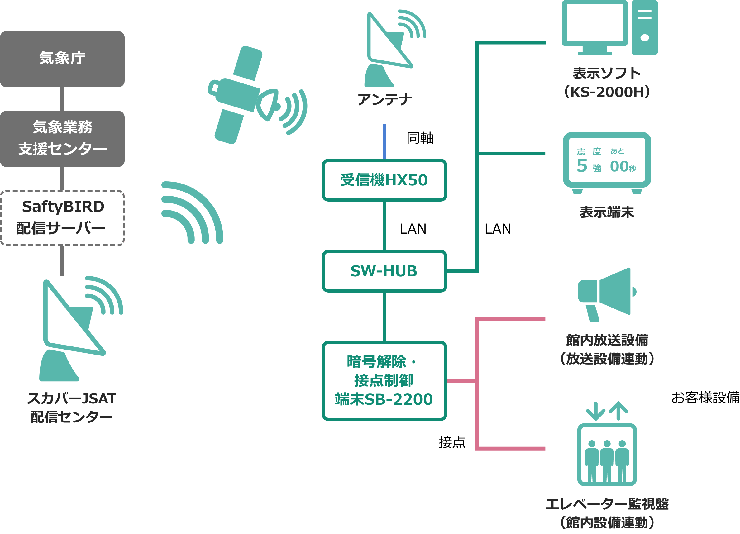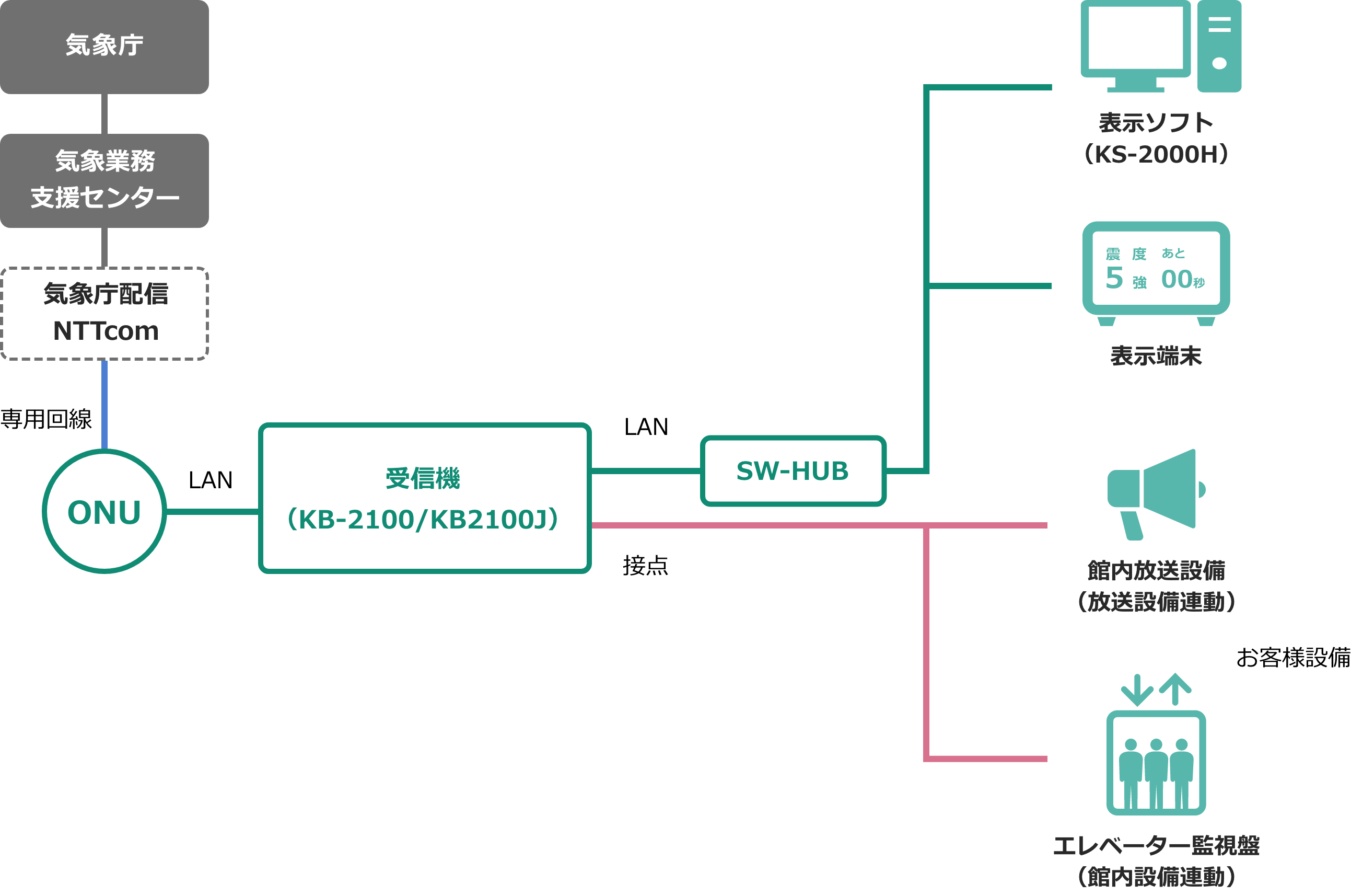 気象庁から発信される緊急地震速報をお客様ご指定の場所(プラント、工場、企業、学校、病院等)に配信・通知します。