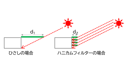 現状では、受信部に直射日光が当たる状況での光無線通信、特に高速通信は不可能に近いです。そのため、LiFi型のような地面に垂直方向で通信するシステムは、屋外では使えないと考えられています。 バックホール型のように地面に平行方向で通信するシステムであれば、直射日光を避けることは可能です。バックホール型でも受光素子(PD)に直接日光が当たる状況(つまり、通信方向に太陽がある状況)では通信ができなくなる可能性がありますが、殆どの場所では山や建物によって遮られ水平方向の日差しを受けないですし、そもそも朝日や夕日の光の強さは比較的弱いためさほど問題にはなりません。それよりも、受光素子に直接日光が当たらずともレンズに強い日光が当たることで、レンズで乱反射した一部の光が受光素子に当たる、カメラ用語でいう「レンズフレア」が発生する状況下においては、太陽光による干渉が大きくなりS/Nが大きく低下することがあります。それを防ぐために、これまでの機器は「ひさし」を付けていました。しかし、ひさしで完全に直射日光を防ごうとすると、長いひさしが必要となり装置サイズが大きくなってしまいます。例えば、東京において日差しの強い午前9時から午後3時までの直射日光を完全に防ぐことを考えてみます。その間の東京における太陽高度は、12月中旬の約13.8°が最低となります。レンズの直径が10cmだった場合、その直射日光を防ぐのに必要なひさしの長さは、レンズ直径の約4倍、つまり40cmになります。40cmのひさしというのは装置サイズに対してあまりに大きすぎます。 バックホール型光無線通信機である三技協のLED Backhaulでは、写真の照明でつかうハニカムフィルター(ハニカムグリッド)を用いて直射日光を防いでいます。バックホール型では、通信相手の機器がある程度遠くにある事が前提となるため、受光できる光は狭い角度の範囲(=ほぼ正面)から来るコリメート光に近い光になります。すなわち、信号を含む光はほぼレンズに対して垂直な光となるため、ハニカムフィルターのような垂直方向の光だけを通過させる装置を付けても信号強度はさほど落ちないのです。そして、ハニカムフィルターは角度の着いた光は全て遮光できます。そのため、太陽光であっても、正面に近い方向以外の、ほぼすべての太陽光を防ぐことができます。