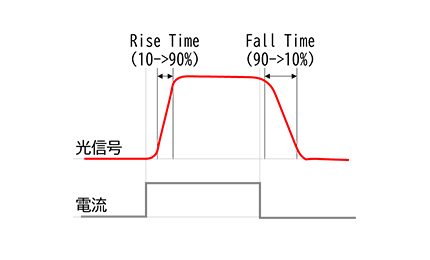LEDの光は、p型半導体とn型半導体の接合部での電子の移動により、電気エネルギーが光(と熱)に交換され、放出されたもので、「自然放出」に分類されます。消えている状態から、完全に点灯するまでの時間、そして点灯状態から完全に消えるまでの時間、すなわち点滅時間は人間の眼には見えないほど短いとは言え、通信にとってはそれなりに長い時間になります。LEDに電流が流れてから、10%の光量から90%の光量にまで光るまでの時間をOptical Rise Timeとよび、その逆に電流が止まってから光が消えるまでの時間をOptical Fall Timeと呼びます。この値は、電流量やLEDの温度などでかなり変動しますが、現在のかなり高速と言われているLEDであってもそれぞれおよそ10ns(ナノ秒)程度かかります。つまり、点灯から消灯まで最低でも20nsはかかります。最大出力を半分にすればOptical Rise/Fall Timeが小さくなりますが、その分ノイズに弱くなり折角のパルス変調のメリットが低下します。