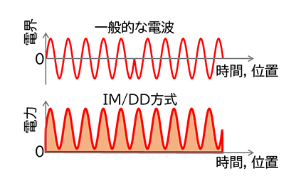 これら2つのメリットがあるため光無線通信にもOFDMが使えればいいのですが、「強さ」でしか通信できない光無線通信ではそのままではOFDMが使えません。仕方が無いので、光無線通信では光の「強さ」にOFDM信号を載せます。これにより、3.と4.の特性を活かした光無線通信が可能になります。この光の「強さ」にOFDM信号を載せる変調方式、つまり前述のIM/DDにOFDMを載せる方式をDC(Direct Current)-OFDM(もしくはDC biased OFDM)と呼んでいます。DC-OFDMにより、パルス変調と比較にならないほど効率的な通信可能となります。