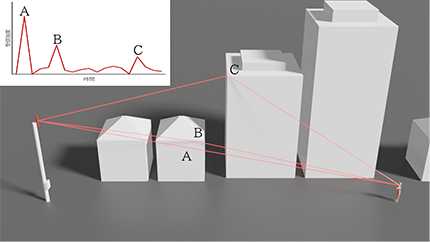 ISIは、反射波、回折波などが多くあるマルチパス環境下で発生します。送信された光は、様々なパス(経路)を通り受信点に到達します。その中で最も受信強度が強いパスから来た光、これは多くの場合最も速く到達する光である事が多いですが、その光を通信機は受信信号として使いたいと考えます。しかし、反射などパスの違う光が、その強い光から少し遅れてやってきて、しかも、それらは全て強力なノイズとなります。