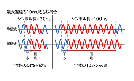 ここで、OFDMが何故3.と4.の特長があるのか簡単に説明します。OFDMは数多くの狭帯域通信を(逆)フーリエ変換によって1つにまとめることにより、全体として高速通信する技術です。サブキャリアと呼ばれる一つ一つの狭帯域通信は低速な通信ですが、それが沢山あるため高速に通信できます。サブキャリア単位で見ると低速通信のため、シンボル長(一つの信号を送るのにかかる時間)が他の高速通信、例えば直接拡散するCDMA等に比べて長くなります。シンボル長が長いということは、それだけ大きな時間的なマージンを取ることができることを意味します。時間的マージンがあればISIの影響は小さくなります。例えば、図のように10nsの遅延を想定しなければいけない場合、シンボル長が30nsだと、通信時間の33%をガードピリオドとして破棄しなければなりませんが、シンボル長が100nsあれば、破棄するのは10%で済みます。この様に、同じ通信速度であればシンボル長が長いほどISIの影響が少なくでき、シンボル長が長くなるOFDMはそれだけISIに強い通信であると言える[2]のです。