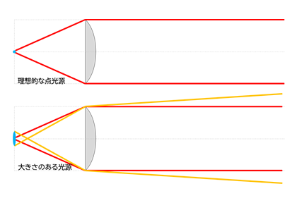 これまで説明したとおり、(おなじシステムだとして)光無線通信の通信距離を伸ばすのは、「LEDの出力」と「コリメート光」の二つのパラメータです。コリメート光は理想的なコリメート光、つまり全ての光が完全に平行になっている状態に近いほど、その利得が高くなります。コリメート光を生成するレンズは通常の球面レンズです。これはレンズの中心軸上にある光を平行にしますが、中心からずれた光は平行にならずに広がってしまいます。それは、中心からずれた光は、レンズに当たる際の角度が理想の角度と差異があるためで、中心から距離があるほど角度の差異が大きくなりコリメート光にならず広がってしまいます。この差異を小さくする方法は2つあります。一つは光源とレンズの距離を広げること、すなわち焦点距離を長くすることです。レンズまでの距離を広げることでレンズへの入光角度は全体に浅くなり、結果角度差異が小さくなります。もう一つは、光源を小さくすること。光源が小さければ小さいほど理想的な点光源に近付き、理想的なコリメート光に近くなります。ただし、光無線通信を考えた場合、どちらにも問題点があります。