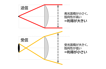 光源を小さくすることそのものはメリットしかありません。しかし、LEDの特性上、出力を上げるには光源面積を広げなければなりません。光源面積が小さく、且つ高輝度のLEDが望ましいことに間違いありませんが、光源面積を取るか、出力を取るか、これらは結果的にどちらがコリメート光成分の出力が大きくなるかで決定する必要があります。ただし、高速通信まで考えた場合、出力が小さい方が、電流幅が小さくなる分LEDの反応速度が速くなる可能性が高く、高速通信には有利になるということを考慮しておく必要があります。