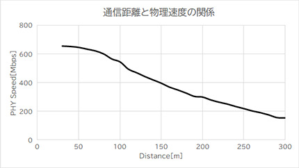 LED BHは適応変調を採用しており、S/Nの上下により通信速度も上下します。光も電波の一種ですから、電波と同じように距離によって減衰します。距離によってS/Nが低下するため、当然通信速度も通信距離によって低下します。LED BHは最大通信距離300mとなっておりますが、その時の物理速度は100Mbps程度になります。また、近ければ近いほど高速になるかと言えば、残念ながらそうではありません。2台の距離が近すぎる場合、サチュレーション(過入力)が発生し、速度が低下する場合があります。LED BHの通信距離と物理速度の関係はおおよそ以下の通りとなります。尚、これは屋内実験環境における測定結果ですので、実際の使用環境や光軸合わせの状況によって値は変化します。