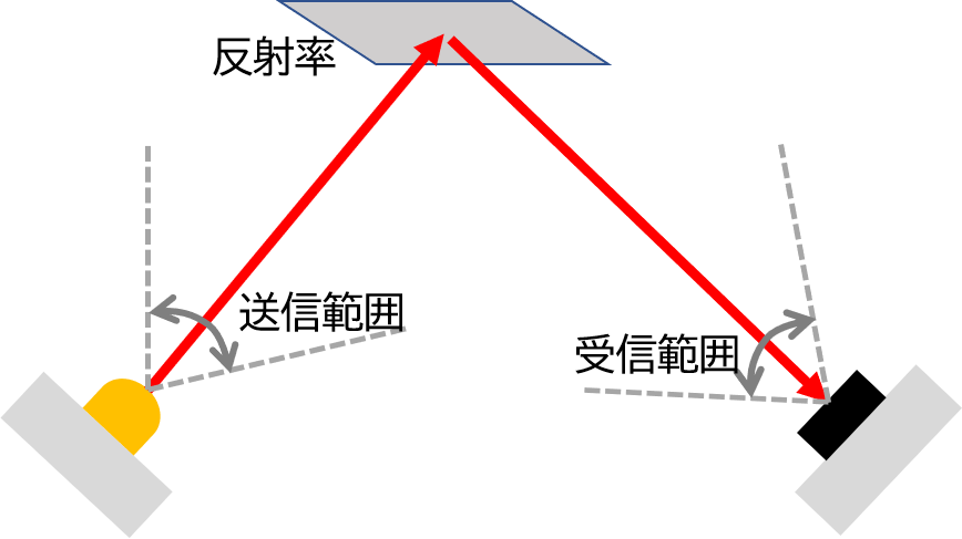 送信機側からでた光が、反射面で反射して、受信角度の範囲に入っていれば受信出来る、ということを図示しています。ここで、NLOS通信の鍵となるパラメータが3つ出てきます。一つは、送信可能な角度、すなわち送信範囲、同じく受信範囲、そして壁の反射率です。