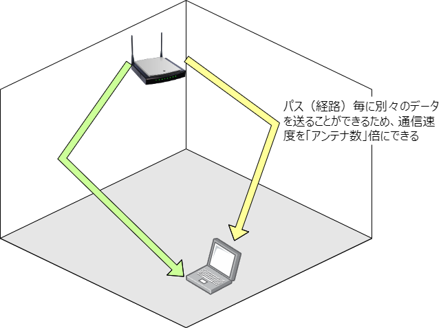 MIMOも最大速度上昇の常套手段ですね。MIMOを詳しく説明するとまた時間がかかってしまいますので、簡単に説明しますが、MIMOは複数アンテナを使って、別々の経路をとることによって「論理的なチャンネル」を増やす技術です。もっと簡単に言えば、2本のアンテナを使ってMIMOを行う場合、1本のアンテナは右の壁に反射させ、もう一本は左側の壁に反射させることで、同じ周波数であってもチャンネルを分けられて、その分トータルの通信速度が向上する、そんな技術です。この例の場合、2チャンネルで通信できるため、通信速度は非MIMOの時と比べ倍にできます。