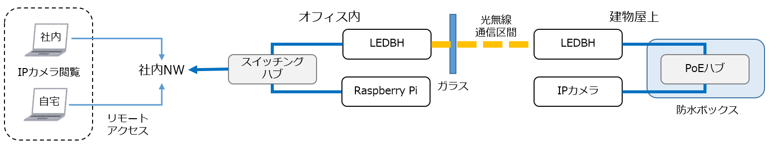 オフィス内のLED Backhaulは社内NWに接続しているため、その先に繋がる機器についても社内NW経由で接続することが可能です。 そのため、IPカメラの映像・画像を本社内や各拠点から、またはリモートアクセスで自宅から社内NWに接続した状態で確認することができ、大雨や台風といった災害時に本社の状況を社外から確認することが可能です。
