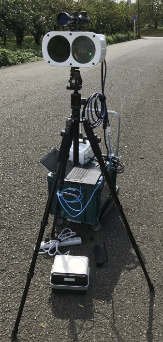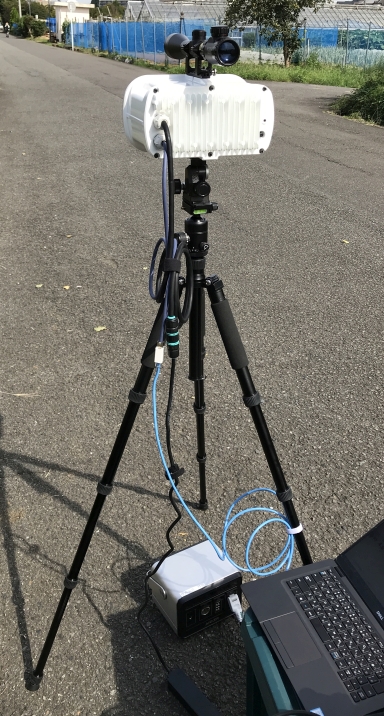 架台を用意することでLEDBackhaulを恒常的に安定して設置することができますが、実験やイベント用に一時的に使用したい場合、このように三脚やバッテリーを用いて短時間で簡単に無線通信環境を構築することが可能です。