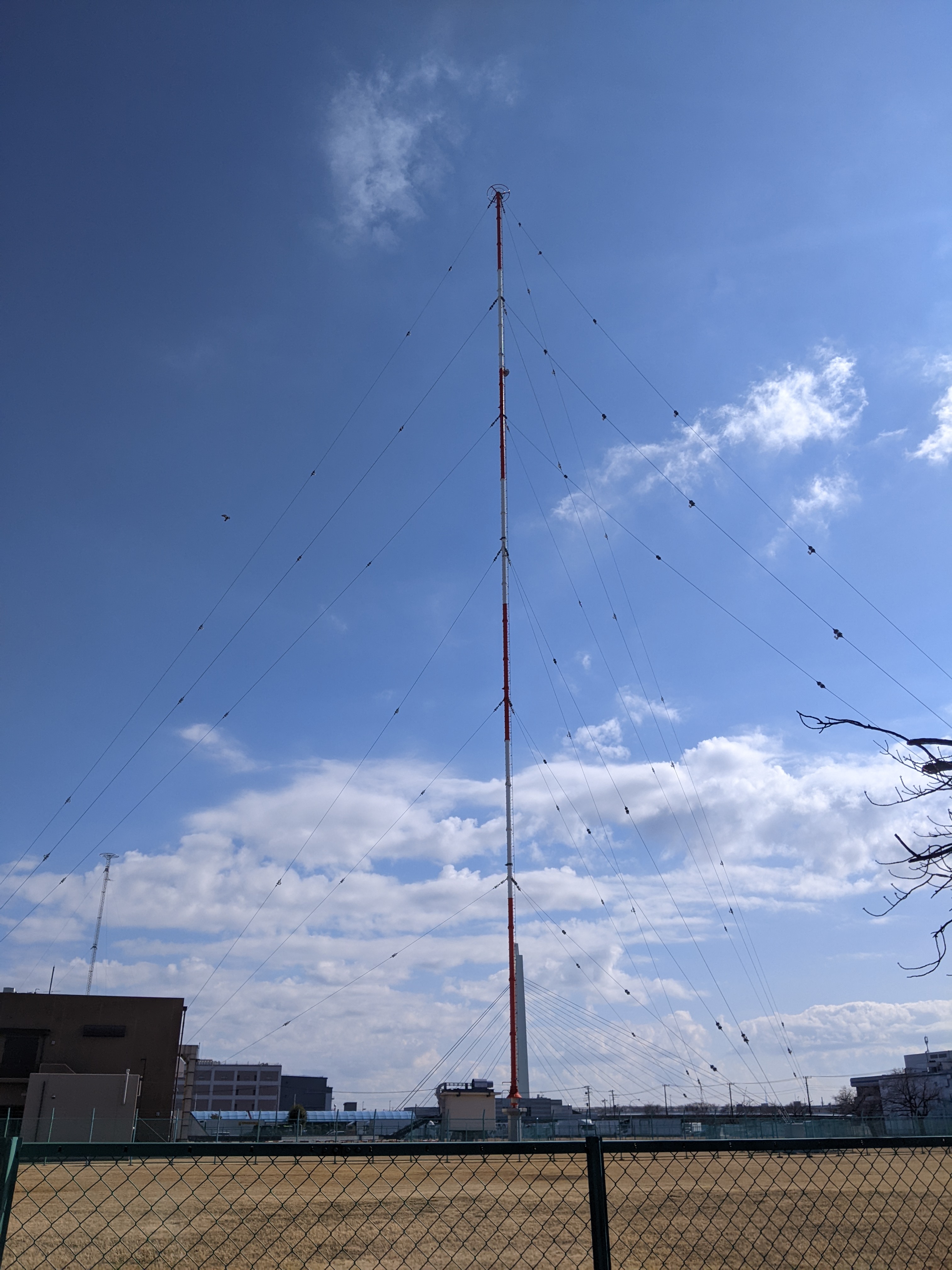 あるんですよ!! この写真は、戸田公園にあるTBSラジオ戸田送信所のアンテナです。アンテナの高さは正確にはちょっと短くて147mらしいんですが、ほぼ波長314mの半分といっていいでしょう。写真の通りアンテナ本体(支柱)はかなり細いため自立できる感じではありません。そのため、それを支えるワイヤー(地支線)が大量に張られており、送信局の敷地面積がかなり広いです。