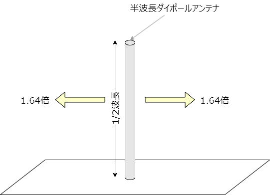 もっとも簡単なアンテナは半波長ダイポールアンテナと呼ばれるアンテナです。名前の通り波長の半分の長さの棒状アンテナで、アンテナなし※3と比べて強さを1.64倍にすることができます。アンテナを地面に垂直に立てたときに、地面に垂直方向に電波を強くしますので、一般的な用途においてとても使いやすいアンテナです。もっともシンプルでもっとも使われていると言ってよいと思います。