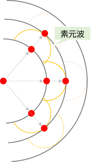 人間から見えるのは大きな波(図のグレーの線)です。しかし、大きな波の一点(赤色の点)を取り上げると、実はその点から新たに全方位に波が発生している、これがホイヘンスの原理の基本です。この波から切り取った小さな一点から発生する波を素元波と呼びます。そして、さらに素元波の一点を取り取り上げれば、そこからまた素元波が発生しているのです。見た目は大きな波であっても、細かく見ると波は小さな素元波の集合体である、というのがホイヘンスの原理です。人間から見える大きな波は、様々なありとあらゆる素元波が重なり合って合成された結果なのです。素元波が重なって強め合う箇所では波が高くなり、弱め合う箇所では波が低くなる、その結果が大きな波として見えているわけです。