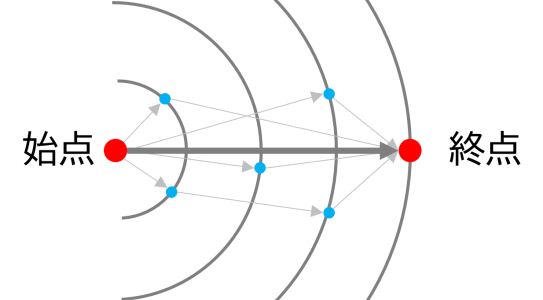 さて、ホイヘンスの原理から波の伝わり方を考えた場合、真っ直ぐに進んでいるように見える波でも、中身は真っ直ぐに進んでいる波だけではない、ということが見えてきます。素元波(下の図の青点)から波はいろいろな方向に広がり、次の場所でまた新たな素元波が発生する訳ですから、図のようにいろいろな経路を通って波は終点まで到達する、ということがく分かります。そうであれば、終点での波高は含む様々な経路を取った波、すなわち素元波が合成された結果と言えるでしょう。