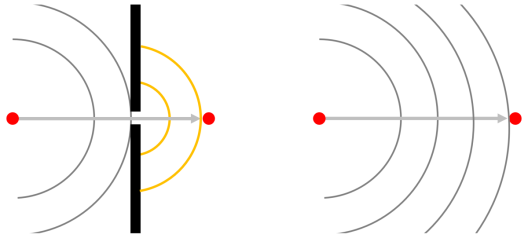 ところで、また回折の話に戻ります。下の図をご覧下さい。左右どちらも正面方向は開いていて波は届きますが、終点にはどちらの波が「強く」届くと思いますか?普通に考えれば、これまでの話がなかったとしても感覚的に右と答えるでしょう。そして、それはもちろん正解です。左はスリットによって波の大部分が遮蔽され、一部しか届きません。そして、スリットから回折で広がってしまうわけですから波のエネルギーは拡散してしまっているのです。ホイヘンスの原理の観点で見ると、左はいろいろなルートを辿ってきて届くはずだった波の多くが届いていないから右に比べ波が弱くなっている、とも言えるでしょう。