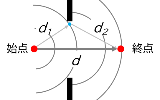 ホイヘンスの原理によれば2点間を伝わる波は考え得る全てのルートを通って来た波の合成になるわけで、理論上のルートは無限に考えられるはずです。だから、先の質問「スリットをどこまで広げたら右と同じか」の答えは、厳密に言えば「どこまで広げても絶対に同じにはならない」ということになります。しかし、ここは数学じゃなくて物理の世界です。波を考えるためには実用上「これぐらいであれば同じと考えて良い」という答えが必要です。距離が長くなればなるほど波は減衰するわけですから、その減衰を考えれば終点での強さに影響を与えられる範囲というのはあるはずです。