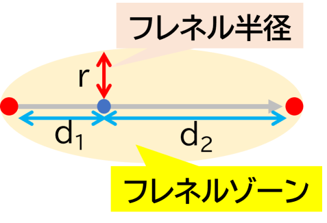さて、電波通信とかで実際の現場でフレネルゾーンを考慮する場合、「楕円ですよ」と言われてもどこが楕円の範囲内で、どこが範囲外なのかを現場で判断するのは難しいものです。しかし、楕円だからこそ始点、終点からの距離が分かってしまえば、その点の半径というのは計算で求めることができます。それをフレネル半径と呼んでいます。例えばアンテナの高さ10mで求めたい場所のフレネル半径が8mだった場合、その場所ある障害物の高さが2m以上だった場合にフレネルゾーンに引っかかる、ということが分かります。