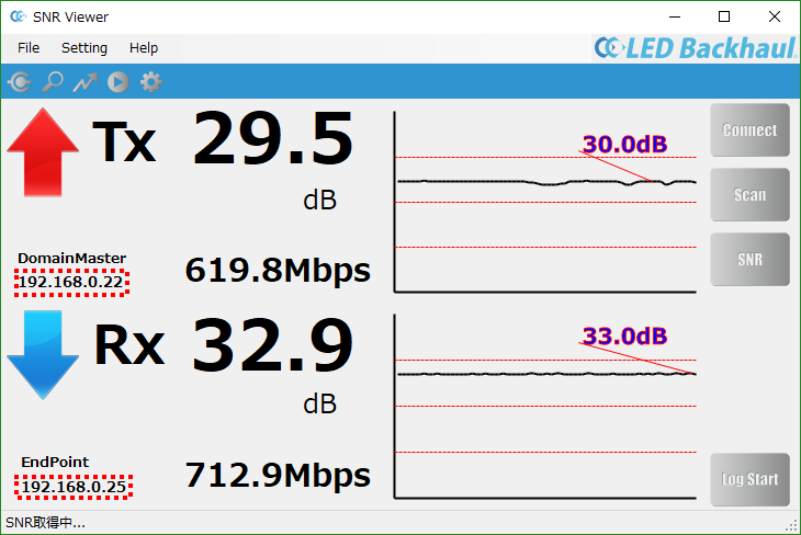 - LEDBH機器設定の変更と光軸合わせのためのSNR取得はIPで行うため、それらが必要な場合は適切なIPアドレス設定が必要となります。