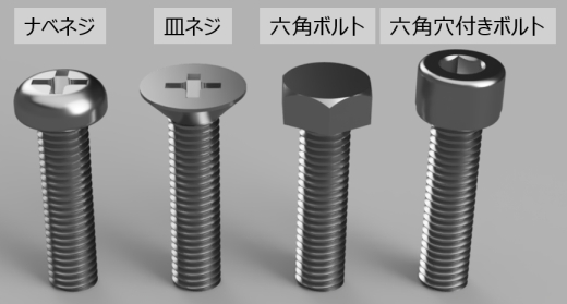 頭の形状によってナベネジ、皿ネジ、六角ボルト、六角穴付きボルト等様々な種類があるネジですが、あらゆるネジは雄ねじ (軸側) と雌ねじ (受け側) のネジ山同士を噛み合わせて締め込みを行います。 基本は右ねじで時計回り (CW=ClockWise) に回すことで締め込むことができ、特殊用途では左ねじで反時計回り (CounterClockWise) に回すことで締まるものもあります。