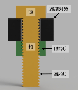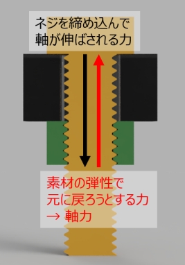 ネジを締め込んでいく途中は軽い力で締め込んでいくことができますが、さらに締め込んでいくと次第に頭が締結対象に引っかかってそれ以上締め込もうとすると非常に大きな力を必要とする状態になります。この時、軸には山同士が噛み合って伸びようとする力、そしてネジの素材が持つ弾性によって元に形状に戻ろうとするバネのような力が働いています。この元の形状に戻ろうとする力=軸力によってネジが止まります。軸力を働かせるためにもしっかりネジを締め込んで固定することが重要です。