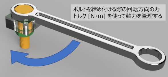 伸び切りを防ぎつつ適切な軸力を発生させるため、太さや素材、使用用途に応じて値は個々に異なりますが、各ネジには締め付けトルクという値が設定されています。 ネジを回転させる力をトルク [N・m] で表し、回転させる際に必要な力から軸に生じている軸力を間接的に算出することができます。