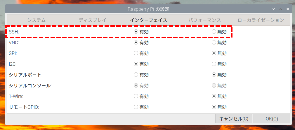 まず、ラズパイ側でSSH接続を有効にする必要があります。これは必ずラズパイ側で操作してください。 メニューから[設定]-[Raspberry Piの設定]を選択すると設定ウインドウが開きます。そこには「インターフェース」というタブがありますので、そこを選択してください。すると、様々な機能の有効-無効を選択できるタブが開きます(図1)。 SSHは上の方にありますので、[有効]を選んで[OK]を押せば設定は有効になります。なお、SSHを有効化するついでに、その下にあるVNCとI2Cも有効にしておいてください。次回以降に使います。