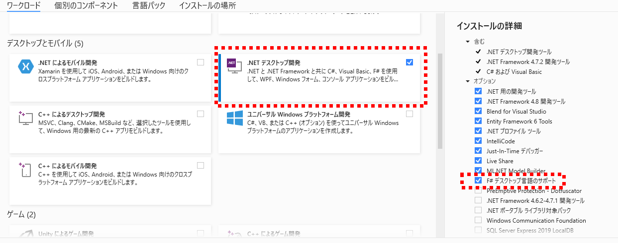 Visual StudioはCommunityバージョンだとしても、全てをインストールするとなるとかなりのサイズ(10GB超)になりますので、インストールする部品(コンポーネント)を選択し必要なものだけをインストールします。F#に必要なものは、図3のように、.NETデスクトップ開発を選んで、オプションのF#デスクトップ言語のサポートを選ぶことで全てインストールされます。C#とVB.NETはオプションではなく強制インストールですので、そこに言語の立場の差を感じますが・・・