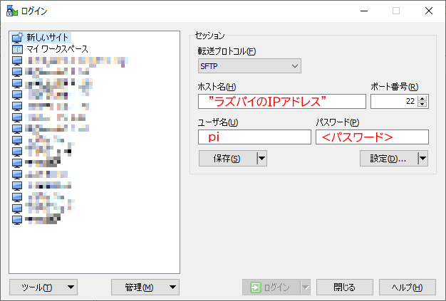 尚、転送プロトコルの欄にある「SFTP」とは「SSHをつかったFTPプロトコル」のことなので、ラズパイのSSHを有効にしておく必要がありますのでご注意下さい。(まだ有効にしていない方はページの上の方を見て下さい。)