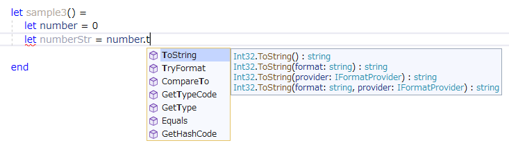 さて、ここまできたらF#のコードを書いて何かを動かしたいところですが、コードを何を使って書けば良いでしょうか?一般に、プログラミングのコードを書くのに何を使っても良いとされています。それこそ、Windowsのメモ帳でも書けますし、かつては秀丸などのテキストエディタでコードを書いている人も多くいました。しかし、今はIDE(統合開発環境)と呼ばれるアプリケーションを使って書くことが一般的です。IDEはコードを書くための支援機能が沢山実装されたアプリです。図3のように自動で次の候補を出してくれたり、エラーを指摘、訂正してくれたりします。そのため、素のテキストエディタよりもずっと楽に、しかも安全にコードを書くことが出来ます。.NET(C#やVB.NET、F#)のコードでは、主に次に挙げる二つのIDEが使われています。どちらもMicrosoft製ですが、その性質は少し異なります。