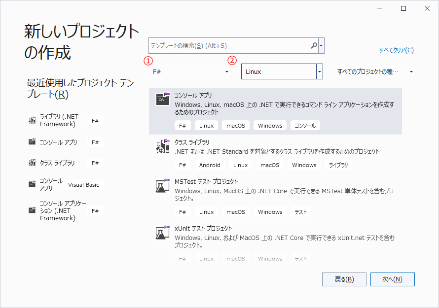 今回作りたいのは、F#のRaspberry Pi(ラズパイ)対応のコンソールアプリです。それには、Linux対応のF#コンソールアプリのテンプレートを使えばいいのですが、この画面にはC#などのテンプレートも含まれるので、テンプレートの数は相当数あります。このままでは目的のテンプレートを探すのが結構難しいですので、フィルターをかけて表示されるテンプレートを絞ります。①の言語選択コンボボックスにはF#を、②のプラットフォーム選択コンボボックスにはLinuxを選んでください。すると、いくつかのテンプレートだけが候補として残りますので、図2の通りF#のコンソールアプリを選んでください。