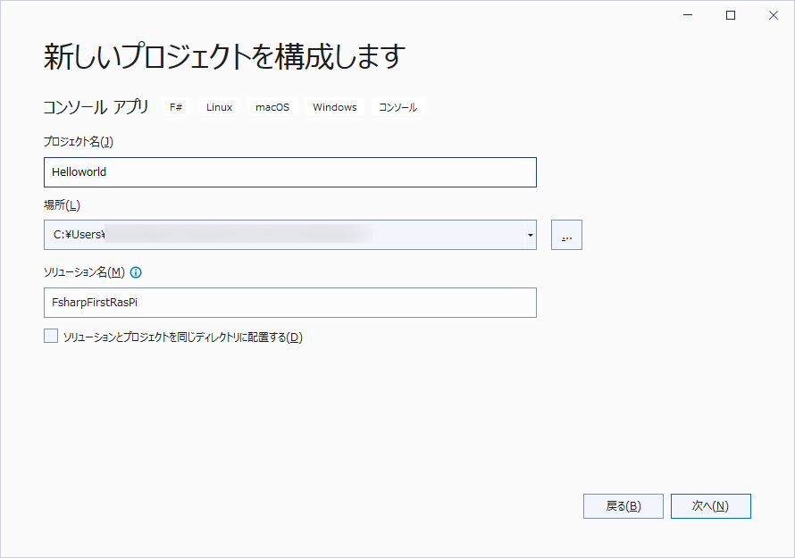 次は、プロジェクトやソリューションに名前を付ける画面です。プロジェクトの名前も、ソリューションの名前も何でもいいですが、今回はプロジェクト名をHelloworldとします。プロジェクト名を付けると、自動的に同じ名前がソリューション名欄に入力されます。プロジェクトとソリューションは同じ名前で構いませんが、ソリューション名を変更し別の名前にすることもできます。今回は後々区別しやすいようにソリューションに別の名前(FsharpFirstRasPi)を付けます。真ん中の場所の欄は、プロジェクト(ソリューション)の保存場所です。個人の開発レベルではドライブ速度はさほど重要ではないので、SSDでもHDDでも、好きな場所を指定して問題ありません。ただし、One DriveやGoogle Driveなどクラウドドライブとの自動同期を設定しているフォルダの指定は、できれば避けた方が良いと思います。VSがおかしな挙動(不要なメッセージを連発)をすることがあるからです。