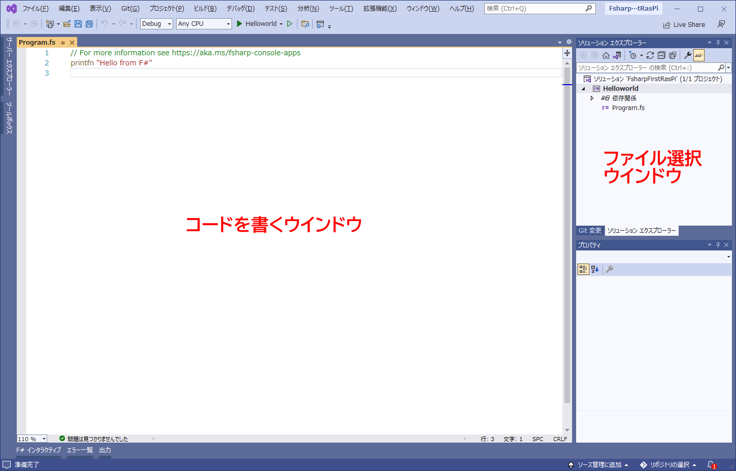 C:\[ユーザーが指定した保存フォルダ]\FsharpFirstRasPi\Helloworld\bin\Debug\net6.0\Helloworld.exe (プロセス 12412) は、コード 0 で終了しました。