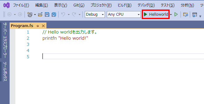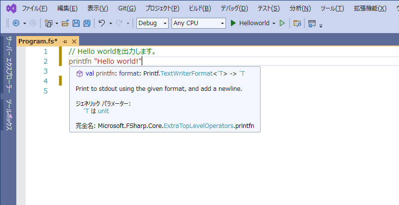 2行目のprintfnは、画面に文字を表示する関数です。F#では、”(ダブルクォーテーション)で囲むと「文字列」として認識します。つまり、この例だとHello from F#という文字列を画面に表示することになります。ちなみに、F#はコード中の大文字と小文字は区別します。例えば、printfnとPrintfnは別のものと見なされます。