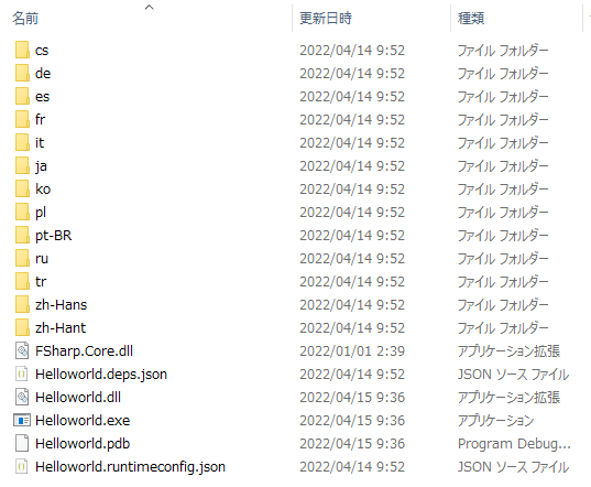 さて、先ほどWindows上での試行の際、実行ボタンを押してから実行までの間に結構時間がかかったと思います。この間、VSはビルドといわれる動作をしていました。ビルドは、ソースコードから実行可能なファイルを作成することを言います。上の実行結果を改めて見て下さい。"Hello world!"の出力に続いて、C:\[ユーザーが指定した保存フォルダ]\FsharpFirstRasPi\Helloworld\bin\Debug\net6.0\Helloworld.exe (プロセス 12412) は、コード 0 で終了しました。というファイル名が付いたメッセージが出力されているはずです。これは「VSによって作成された"Helloworld.exe"というファイルを実行し、終了しました」ということを意味します。つまり、この実行ボタンを押した後、VSは"Helloworld.exe"というWindows用の実行ファイルを作成し、それを実行するという動作をしていたのです。そのことは"Helloworld.exe"のあるフォルダの中身を見ることで確認できます。フォルダの中を見ると実は"Helloworld.exe"以外にも沢山のファイルやフォルダを作成しているのが分かります(図7)。