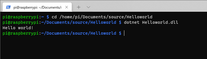 そして、ここで実行です。Windowsの実行ファイルは"exe"ファイルでしたが、ラズパイの実行ファイルは"dll"ファイルです。dllファイルはいくつかありますが、通常実行ファイルは「プロジェクト名」がつけられますので、今回の場合はHelloworld.dllファイルが実行ファイルとなります。これを実行するために.NETと合わせて、コマンドを次のように打って下さい。