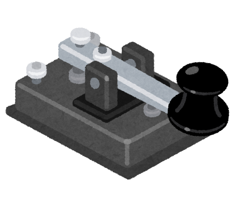 一方の無線も、元々はON/OFF、すなわち電波の有無によって通信していました。無線のモールス信号がまさにそれです。打鍵する、つまりスイッチを押すとON、離すとOFF。上記の電子回路と同じONとOFFを切り替えての通信です。(良い写真がなかったので、”いらすとや”さんの図です)