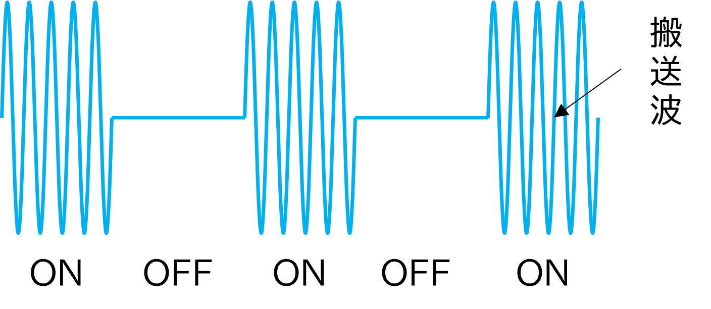 モールス信号と電子回路が違うのは、電波で送る・受ける、ということ。残念ながらアンテナにそのままONとOFFの電圧をかけてもまともに電波は飛びません。電波として飛ばすためにはその言葉通り「波」である必要があります。そのため通信したい場合は、まず「ベースとなるある周波数の電波」を作って、それをON/OFFをすることで信号とします。ちなみに、この「ベースとなるある周波数の電波」の事を搬送波と呼びますが、モールス信号による電波通信はその搬送波をON/OFFすることで通信する通信と言えるでしょう。このような電波のON/OFFで通信する方式を、一般にOOK(On-Off Keying)又はASK(Amplitude-Shift keying)と呼んでいます。