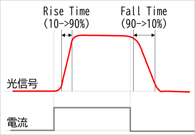 LEDは人間の眼で見ている限り非常に高速に点滅することができますが、高速な通信をするための光源として見た場合はさほど高速ではありません。点灯、消灯するには結構な時間がかかります。LEDの点滅性能は10%点灯から90%点灯まで、及びその逆の90%点灯から10%点灯までの時間で表されますが、要するにこの時間が結構長いのです。ONとOFFだけで通信をするOOKでは、この点滅速度がそのまま通信速度の上限に関わってきます。最大通信速度が100Mbps程度で済んでいた時代であればそれでよかったのですが、それを超える速度になってくるとOOKでは高速化が難しくなっていきます。