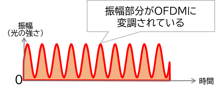 ”仕方がないので”、今現在は振幅、すなわち光の強さにOFDM信号を載せるといううことをやっています。
