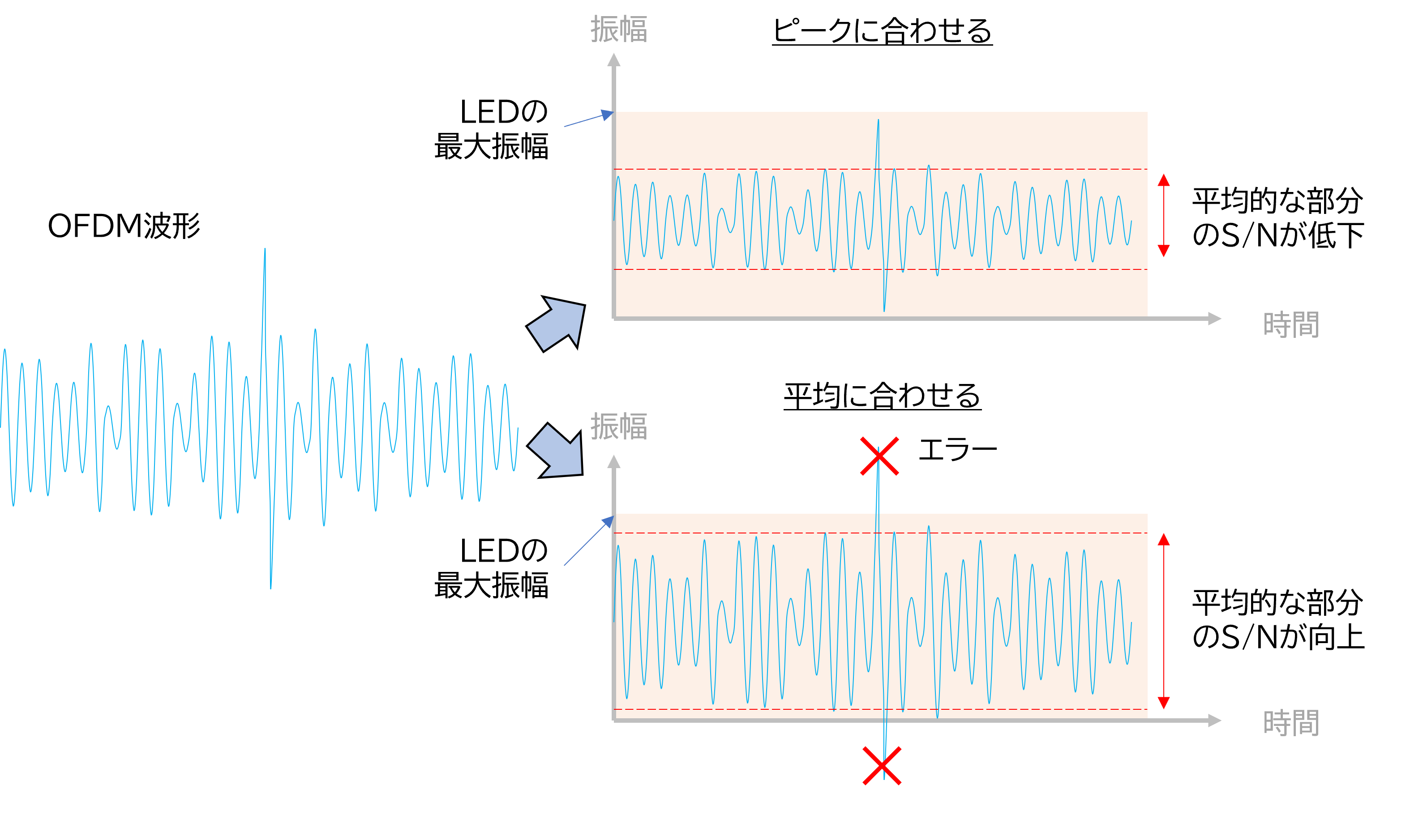この方式をDirect Current biased-OFDMでDC-OFDMと呼んでいます。光にOFDMを載せる技術はいくつかありますが、その中で最も簡単なものがこのDC-OFDMです。OFDM信号をそのまま振幅で表すだけです。ただし、電波は電界ですからプラスマイナス両方存在しますが、光は光の「明るさ」だけですのでプラスの値しか取れません。したがって、プラスからマイナスまで全部の波形を振幅に載せるため、必要な光の振幅は大きくなります。しかも、OFDMそのものは、(理論上は)多数の搬送波の合計であるため、頻度は高くないものの振幅的にピークがすごく大きくなる瞬間があります。これをピークピーク値(P-P値)やピーク対平均値比(PAPR)が大きいという言い方をします。その大きいP-P値を全て光の振幅に収めることができればいいのですが、LEDの光の振幅、つまりは光の明るさの幅はそこまで大きくないため、無理矢理全て波形を押し込もうとすると、平均的な波形部分が小さくなって通信全体を見たときのS/Nは低下してしまいます。多くのDC-OFDMでは、ピークの一部を捨てる行為が必要となります。