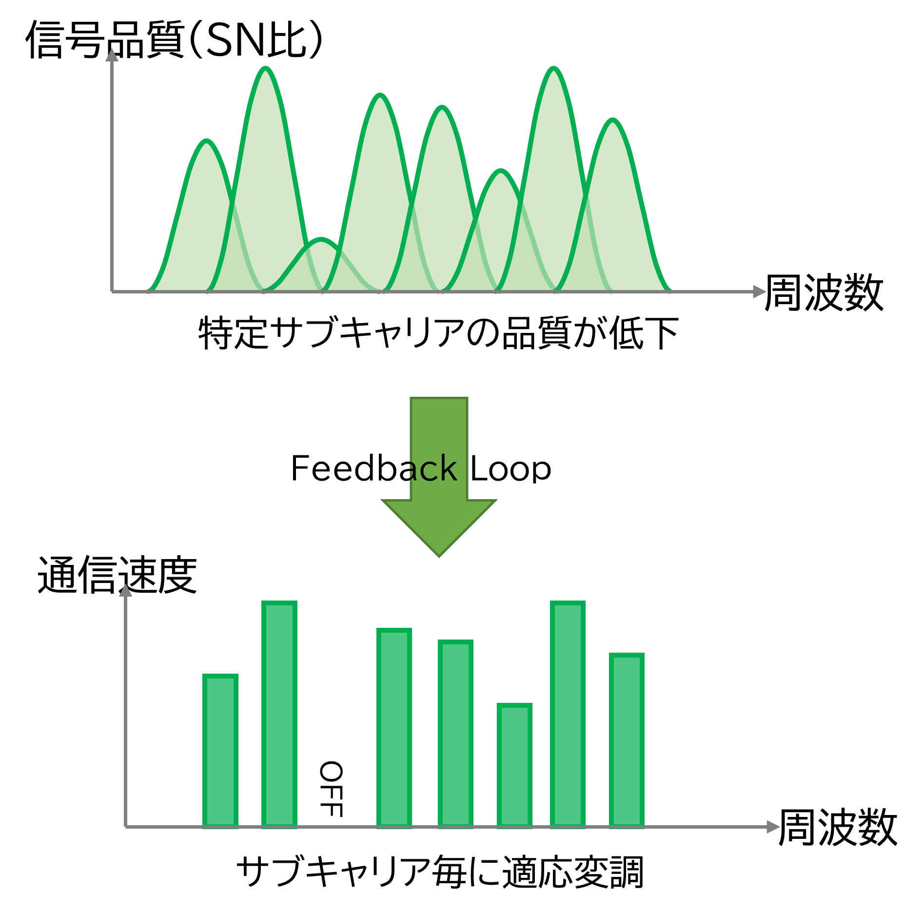 DC-OFDMは、元がOFDMですので振幅と位相を変化させることで、通信速度を変えることができます。皆さんも聞いたことがあるであろうQAMです。16QAMや256QAMなど2のn乗の数値をとり、それは1シンボルn(bit)送信できることを意味します。16QAMは2の4乗、つまり4bit、256QAMは同様に8bit。つまり256QAMは16QAMの倍の速度で通信できると言うことです。段数は刻めるため、速度はPAMよりも細かく変化させることができます。しかもOFDMでQAMを使えば、適応変調をサブキャリア毎に使うということもできます。その場合、適応変調の階調は、QAMの段数 x サブキャリア数となるため、全体としての速度の変化は何百、何千段階にも変化できます。