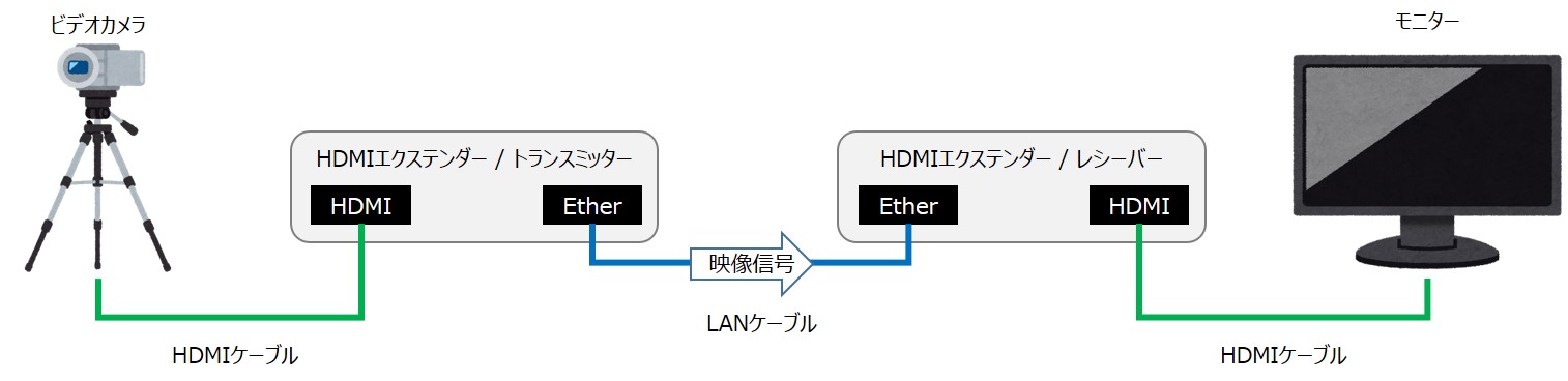 送信側となるトランスミッター、受信側となるレシーバーの2台1セットを基本構成とする機械で、トランスミッター・レシーバー共にHDMIケーブルとLANケーブルが接続できるようになっています。HDMIエクステンダー実機と機材構成例は下記図1・2の通りです。 トランスミッターはHDMIケーブルから映像信号を入力として受け取り、LANケーブル側に出力します。レシーバーはLANケーブル側から受け取った信号をHDMIケーブルに映像信号として出力します。 このトランスミッターとレシーバー間、LANケーブル区間の伝送方法によってLED Backhaul対応か否かが決まりますので、対応・非対応について次章にて記します。