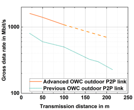 FWAアプリケーション には、ミリ波領域(例︓60GHz)の指向性無線リンクを使⽤することができます。しかし、すでに過密な周波数帯であるため、モバイルアクセスには希少な無線帯域も必要となります。FWAアプリケーションとモバイルアクセスアプリケーションの間の複雑な調整を避けるために、LEDベースの光ワイヤレス通信(OWC)を使⽤してミリ波スペクトルを緩和し、トラフィックを光スペクトルにオフロードすることを提案します。LEDベースのOWCは、LiFiとも呼ばれ 、近年頻繁に議論されています。モバイルアクセスではモビリティやマルチユーザーサポートなどの機能が提供されていますが、WTTHアプリケーションではLiFiを60GHzの代替として使⽤することもできます。都市部では、⾃由な視線(LOS)が得られる確率がかなり⾼くなっています。ポイント・ツー・ポイント(P2P)トポロジーのLiFiに必要なプロトコルは簡素化されています。OWCのフロントエンドには、指向性の⾼いLOSリンクを実現し、光学的な損失を低減するために、追加のレンズが装備されています。LiFiは、200m超の⻑距離P2P屋外通信で実証されています。OWCリンクは,⼤気中の減衰や散乱によるSNR(信号対雑⾳⽐)の変動にもかかわらず、クローズドループのレート適応により,99.9%以上の稼働率を達成しています.