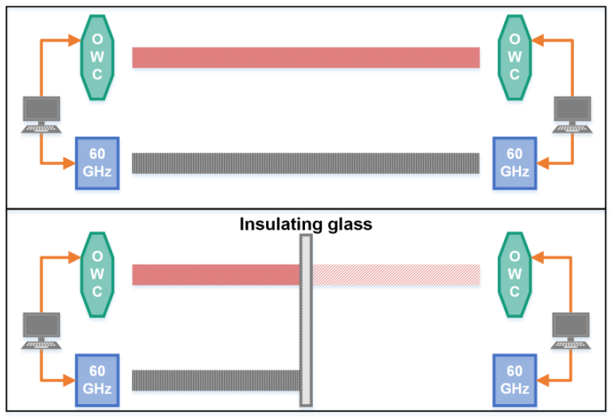 低コストのFWAソリューションとして使⽤するために必要なのは、CPE(顧客構内設備)をすべて屋内に設置することでした。無線リンクは断熱ガラスで完全に遮断されているため、システムを屋内と屋外に分け、ケーブルで接続して家の持ち主が配置する必要がありますが、これは望ましくありません。通信事業者は、オールインドアのCPEに興味を持っています。本論⽂では、FWAアプリケーションのための先進的なOWCプロトタイプのデモを⾏い、意図した展開シナリオでの初期測定結果を報告します。いくつかの伝送距離におけるデータートを報告し,低カーボンフットプリント住宅で使⽤されることが多くなっている⾦属コーティングされた断熱ガラスが,商⽤の60GHz無線リンクとの伝送性能に及ぼす影響を⽐較しました。