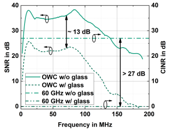 - OWCの場合、断熱ガラスを入れた場合では入れない場合と比べて約13dBのSNR低下が見られる