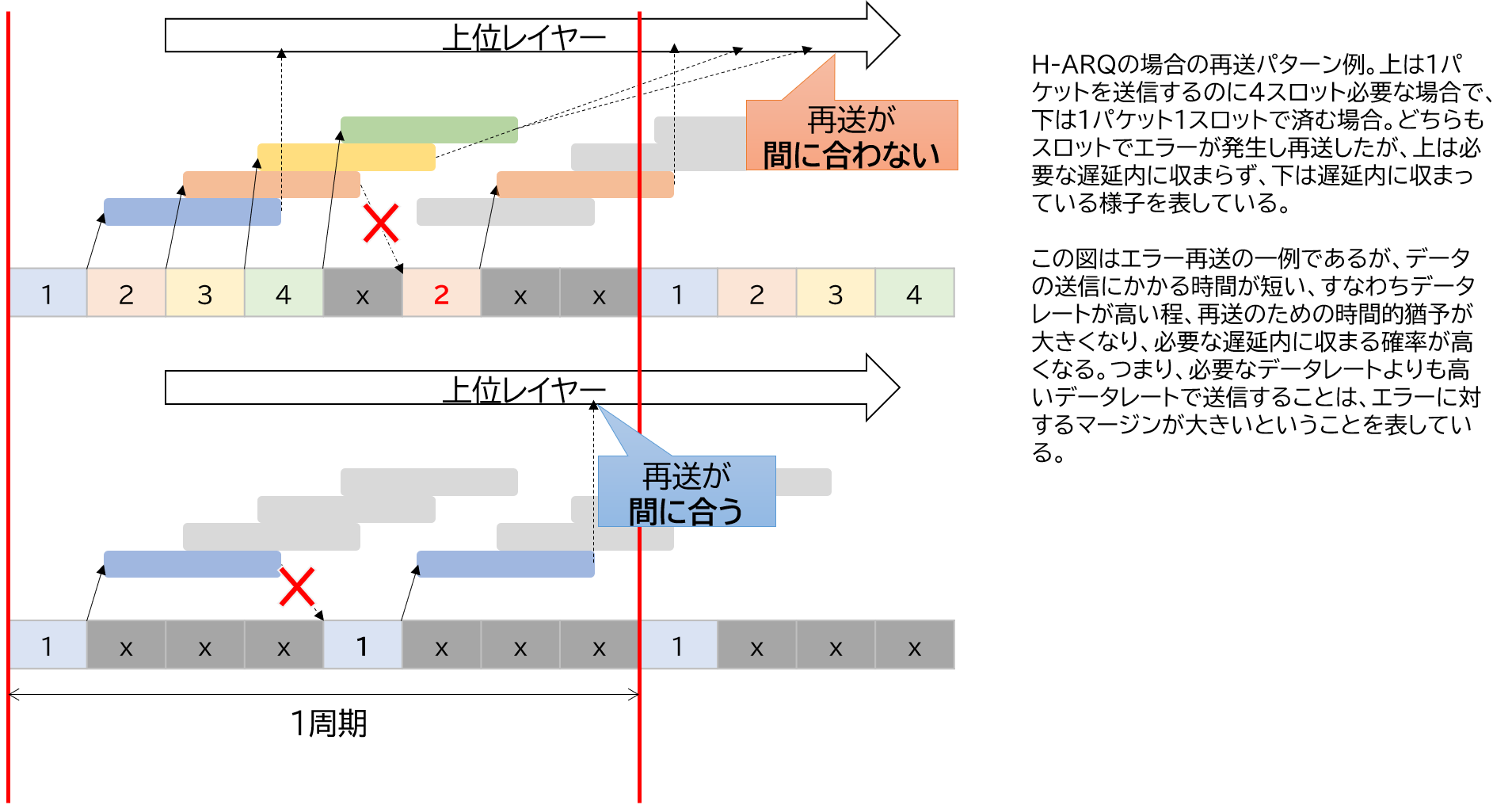 また、最終的なエラー率を低下させる現実的な方法としてはエラー再送があります。TCPのような上位レイヤーでエラー再送を行う方法もありますが、遅延を少なくするためにはHybrid-ARQ[6]のような物理層に近いレイヤーでのエラー再送が必要でしょう。しかし、それでもエラー再送は「やり直し」なので時間がかかります。エラー再送があっても必要な遅延以下にするためには、必要なデータレートより何倍も高速にデータを送信しておき、再送にかかる時間を稼ぐ必要があります(図3)。このことはシャノンの定理[7]でも説明されることですが、同じ通信速度で通信するのであれば、送る回線が広帯域(高速)である方が、相対的に低エラー率、低遅延を実現できるということになります。