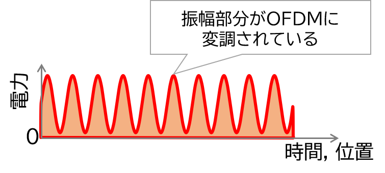 他からの干渉が殆ど無い光通信ですが、「光」そのものでいえば、実はというか当然のことですがノイズは多い環境です。太陽光や照明光、車車間通信でいえばヘッドライトやテールランプも強力なノイズです。しかし、これらには対策があります。LEDBHは変調方式としてDC-OFDM方式を採用していて、これは光の振幅をOFDMで変調するという方式です(図4)。OFDM方式のため、振幅が直流や低周波の光は復調の段階でカットされます。つまり、太陽光や照明光、ヘッドライトなどの「非通信」の光は、さほど通信に影響を与えないのです。