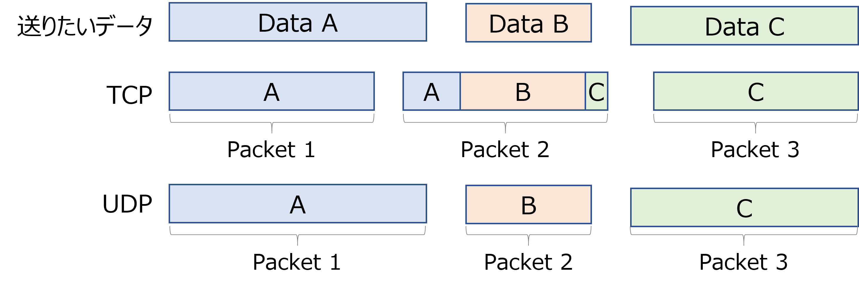 TCPは送りたいデータパケットの切れ目を考慮せず、一度スタックしてから一定サイズで送り続ける「ストリーム志向」なのに対して、UDPはサイズ一定ではなく、送りたいデータパケットをそのままの形、サイズで送れる「メッセージ志向」です。