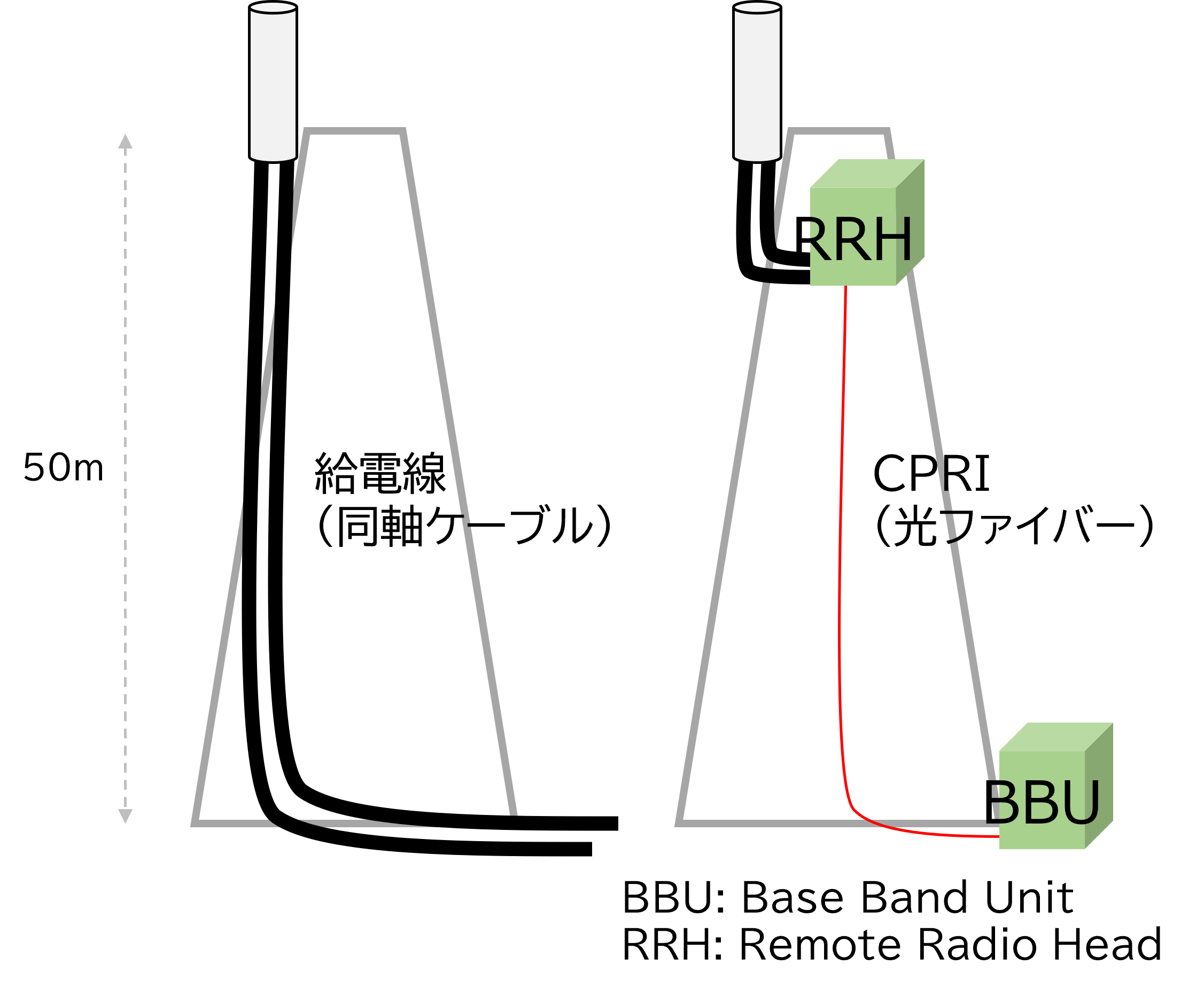 そこで、無線機を二つに分割して、比較的メンテナンスが必要な「信号処理部分(BBU)」と、故障しにくい電波を吹くだけの「無線機(RRH)」の2つに分けて、BBUは地上に、RRHを鉄塔上に設置することにより、長い同軸ケーブルが不要でかつメンテナンスしやすいという構成になるようになりました。そして、このBBUとRRHの間を結ぶ線の通信プロトコルがCPRIなのです。