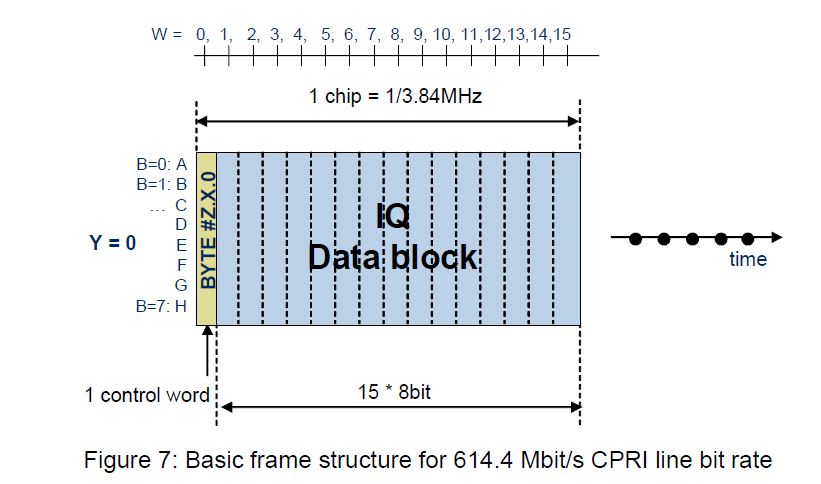 BBUとRRHの間をつなぐのがCPRIですが、CPRIにはどんなデータが流れているでしょうか?実は、この電波で送信する波形、および受信した波形が「デジタルの形で」送られています。携帯電話のデータは基本的にQAM※3ですので、変調した波形はIQの波形になるわけですが、それをそのままデジタルとして送っています。ちょっと分かりにくいですが、CPRIのスタンダード(v2.1)から、CPRIの基本フレーム構成の一例を引用します。