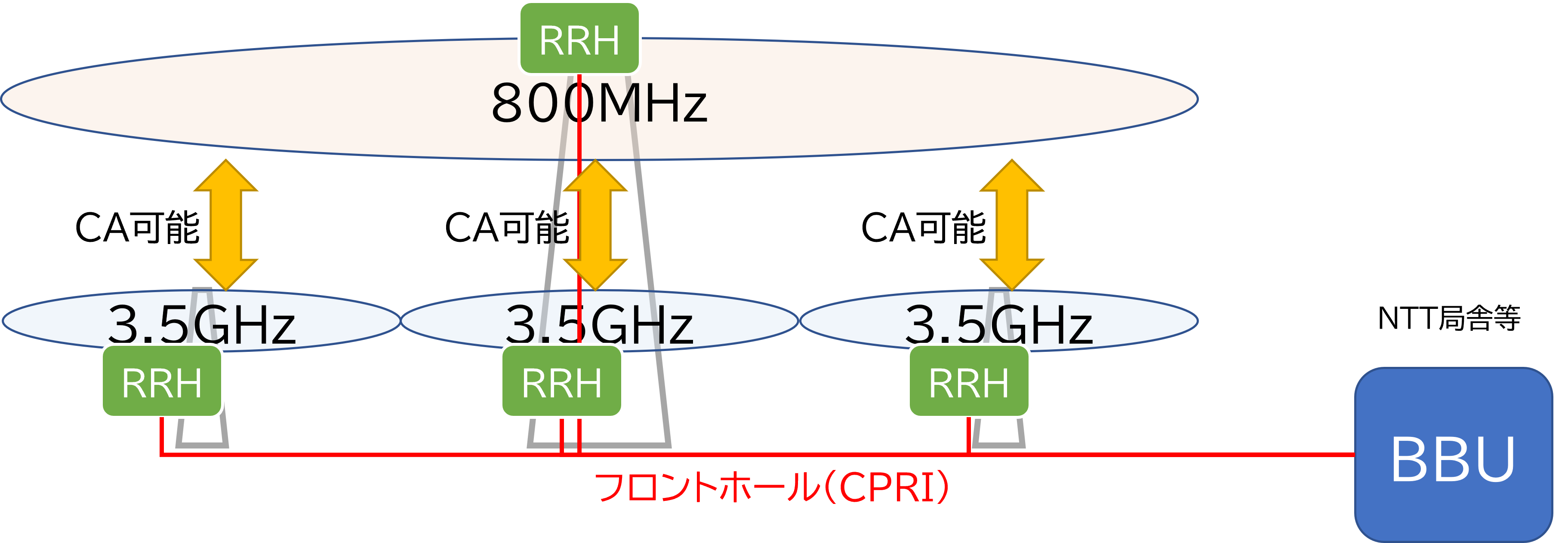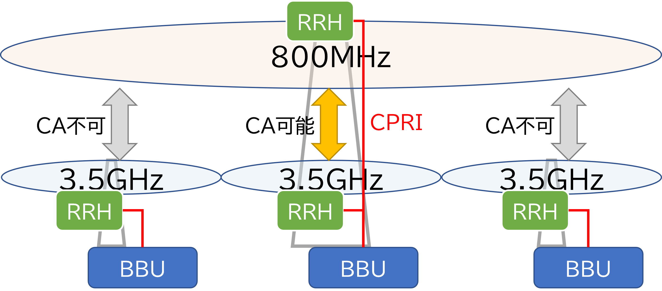 LTE高度化の一つに隣接したセル(アンテナ)同士が出力を調整して干渉を低減させるCoMPという機能があるのですが、これは極めて厳密な時間同期が必要なため、同一基地局内でないと使えないというものでした。別の言い方をすると、同じBBUに繋がっている別のRRHとの間でしかCoMPは機能しないのです。ご存じの方も多いであろうキャリアアグリゲーション(CA)も同じです。複数の周波数バンドを束ねて使うことで高速化を実現するCAですが、これも同一BBUでないと機能しません※5。